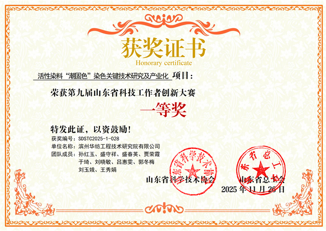 近日,在第九屆山東省科技工作者創(chuàng)新大賽決賽中,公司工程技術(shù)研究院團(tuán)隊(duì)研發(fā)的“活性染料‘潮固色’染色關(guān)鍵技術(shù)研究及產(chǎn)業(yè)化”項(xiàng)目,經(jīng)多輪嚴(yán)格評(píng)審,從282個(gè)入圍決賽的優(yōu)秀項(xiàng)目中脫穎而出,榮獲大賽一等獎(jiǎng)。